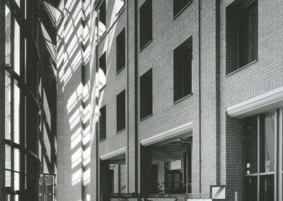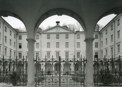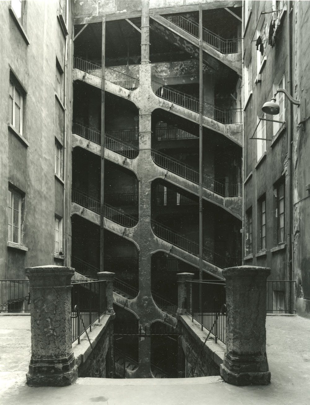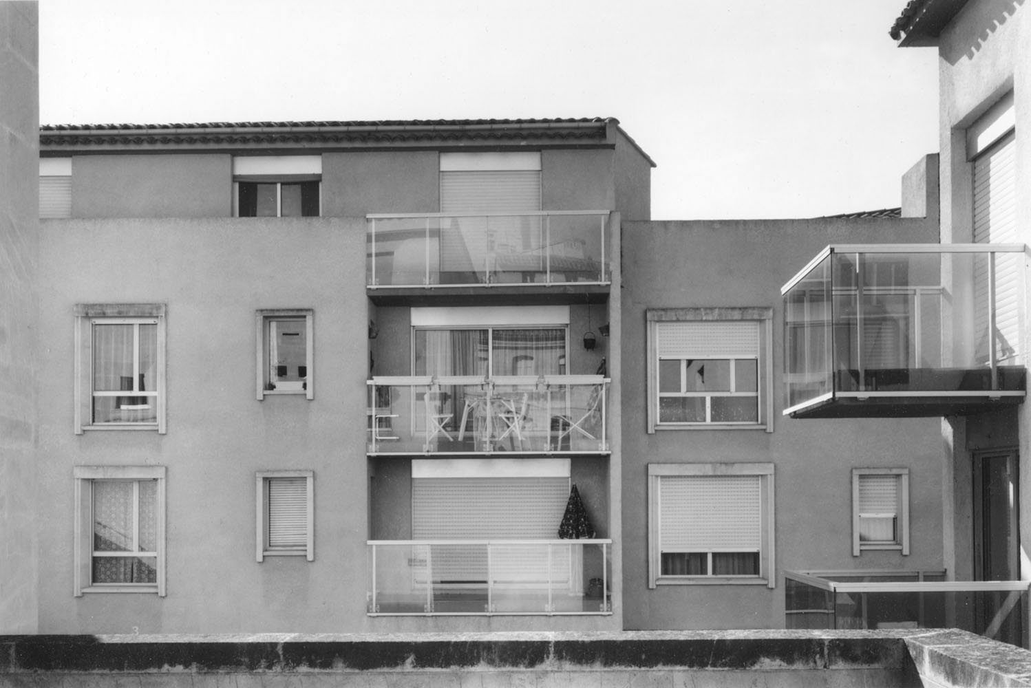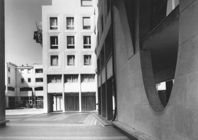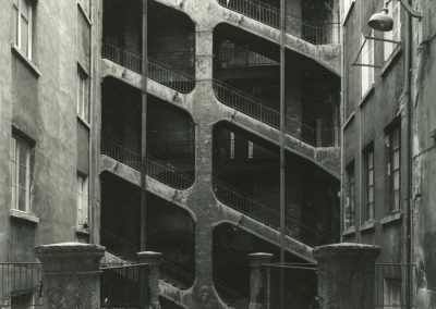 C’est dans cette représentation de La città ideale[1], panneau dit d’Urbino, tableau emblématique de la construction perspectiviste de la renaissance italienne, que cette recherche photographique prend sa source. On y retrouve la frontalité des façades, la rigueur de la construction et notamment le respect des lignes horizontales et verticales, la position du point de fuite dans l’image.