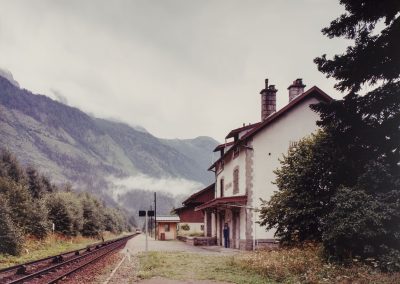 Mais ce travail photographique ne se contente pas de reproduire un schéma préexistant. Il prend en compte, bien évidemment, la notion de point de fuite propre à la représentation de la perspective et la notion de point de vue propre à la photographie, mais également la notion de point de l’œil, décrite par Hubert Damisch[2] dans son ouvrage L’origine de la perspective, point du sujet se trouvant directement dans l’axe du regard. Ce point de l’œil, habituellement situé au centre de l’image photographique est ici confondu au point de fuite et peut se déplacer dans l’image.
